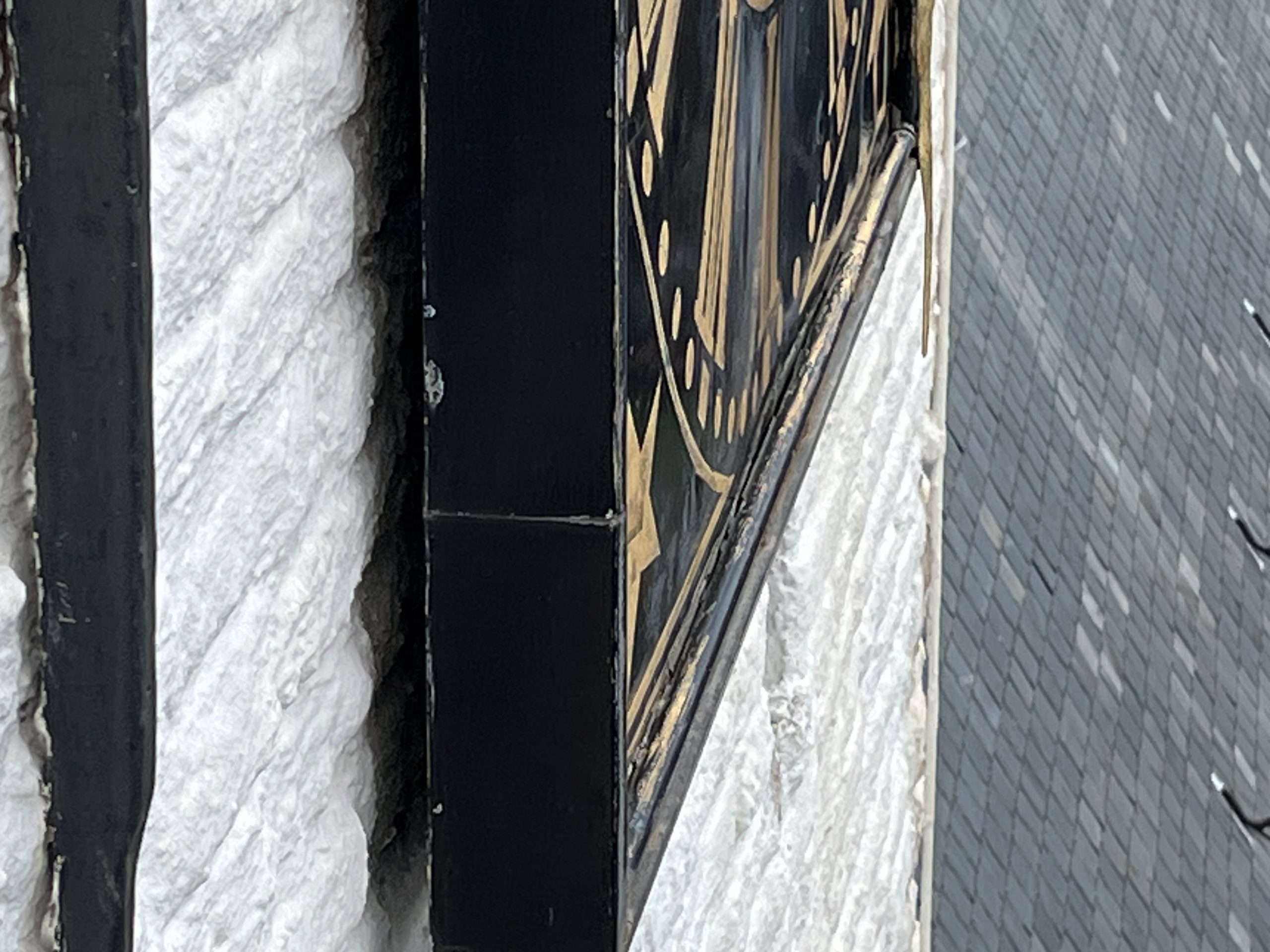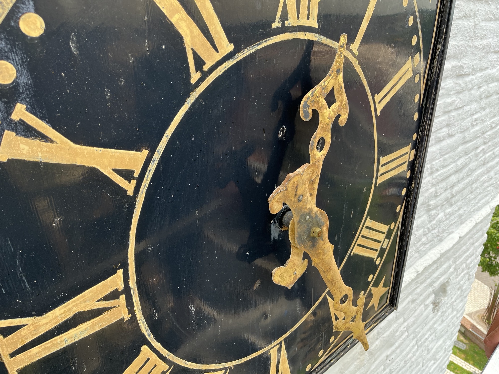 De 3 metalen wijzerplaten en de wijzers van het uurwerk zijn door het weer aangetast. Op verschillende plaatsen is roest aan het metaal zichtbaar, het schildwerk afgebladderd en het verguldsel op de wijzerplaat en de wijzers is verweerd en dof geworden. Het is goed te zien.
