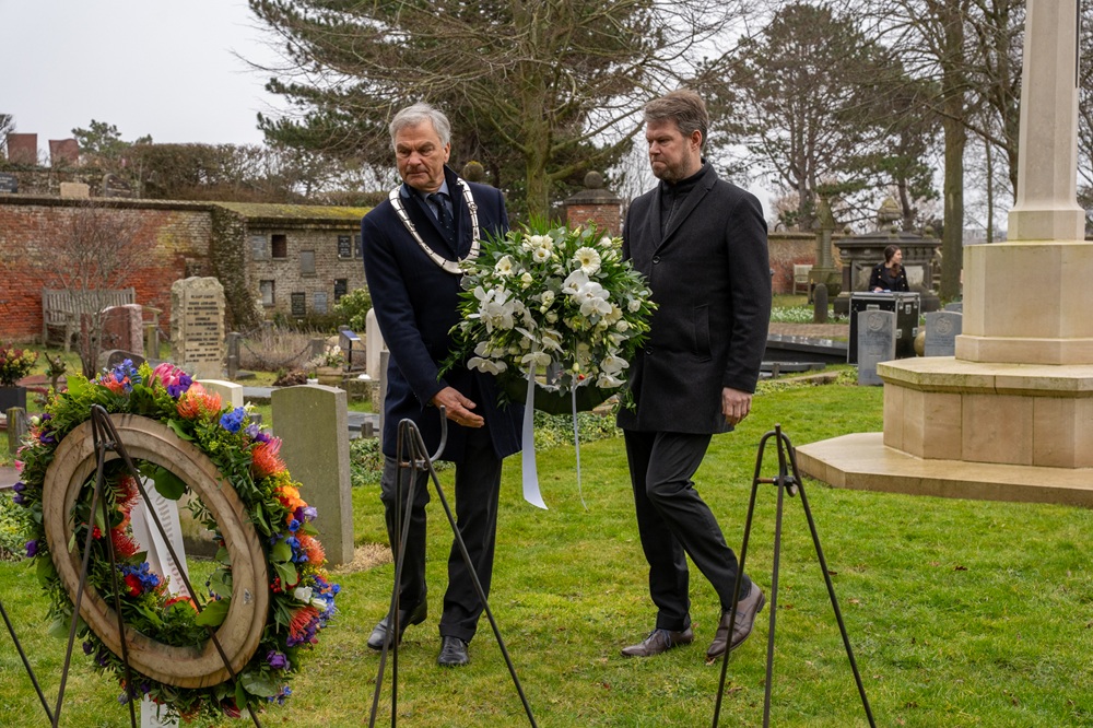Waarnemend burgemeester Bernt Schneiders sprak de aanwezigen toe. Hij vertelde dat hij pas sinds zijn komst naar Noordwijk bekend is geraakt met het verhaal van de SS Mendi. En dat het hem heeft geraakt. In zijn toespraak legde hij de link met het heden, waarin oorlog, ongelijkheid en vluchtelingen nog steeds aan de orde van de dag zijn. “Achter elk oorlogsslachtoffer zit een gezicht. Een verhaal. Daarom is het zo belangrijk om te blijven herdenken.”